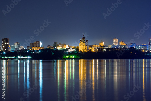 Naklejka premium Night View of the city of Khabarovsk from the Amur river. Blue night sky. The night city is brightly lit with lanterns. The level of the Amur river at around 159 centimeters.