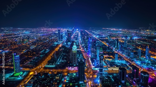 © Lucy, Fototapeta premium Night view of the city skyline in Saudi Arabia featuring the illuminated Kingdom Tower glowing with blue lights. Aerial view of vibrant skyscrapers and bustling streets, capturing the essence of moder