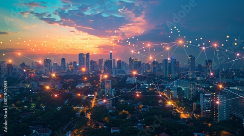 © Chuemon, Fototapeta premium Night view of the city skyline sparkling with a network link, Generative AI