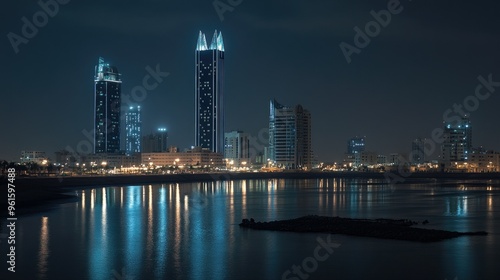 © arthit, Naklejka premium Night view of the Four Seasons and Hilton Hotels in Manama, Bahrain, their illuminated towers adding to the city stunning skyline.