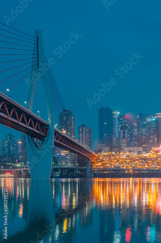 © Zimu, Fototapeta premium Night view of the Qiansimen bridge and the skyline in Chongqing, China.