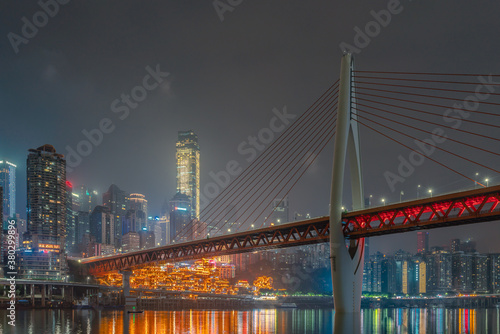 © Zimu, Obraz premium Night view of the Qiansimen bridge and the skyline in Chongqing, China.