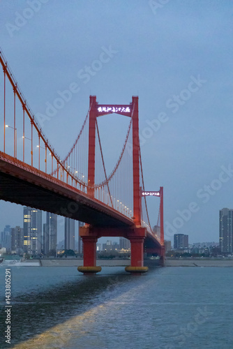 © Xiaohan Zhou, Naklejka premium Night view of the Yingwuzhou Yangtze River Bridge, taken in Wuhan, Hubei, China