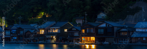 © hit1912, Obraz premium Night view of traditional boathouses at Ine Town in Kyoto, Japan.