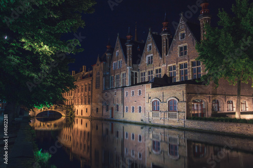 Obraz premium Night view of typical canal of medieval city of Brugge with traditional houses