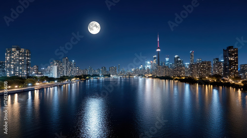 Naklejka premium Night view of urban skyline with moonlight reflecting on water, creating peaceful atmosphere