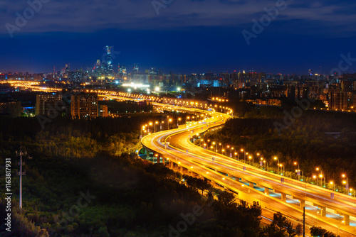 Fototapeta premium Night view of winding road to Beijing CBD area before sunrise