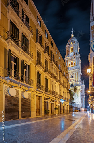 Fototapeta premium Night view streets and the cathedral in Malaga, Spain. Beautiful cityscape of...