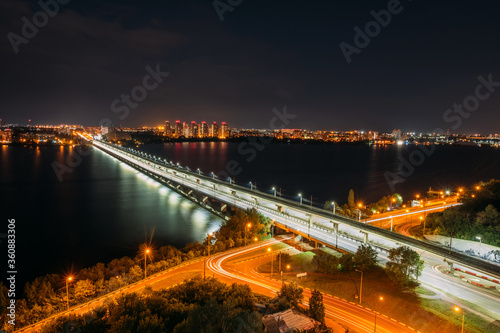 Fototapeta premium Night Voronezh. Northern bridge over Voronezh river, aerial view