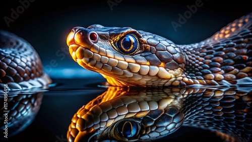 Fototapeta premium Night Water Moccasin, Striking Venomous Snake in Dark Swamp