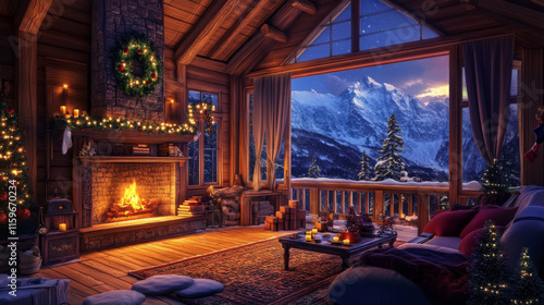 © Sahraya, Obraz premium Night winter chalet interior with fireplace and garland vector cartoon illustration. Panoramic hotel apartment living room with terrace and dark mountain view from window. Wooden cottage furniture