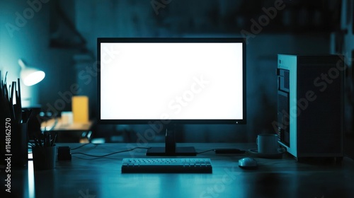 Naklejka premium Night Workspace: Illuminated Desktop Computer Setup