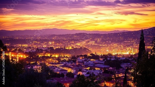 © @Luthfi, Fototapeta premium Nightfall over the Cityscape: A Panoramic View of Urban Lights at Sunset