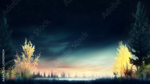 © makappa, Naklejka premium Nightfall scene in a forest field with beautiful dreamy sky