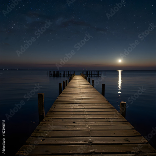 © Aesky, Fototapeta premium Nightfall Serenity Wooden Dock Extending to the Moonlit Sea