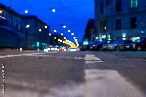 Fototapeta premium Nights lights of the big city, the night avenue with headlights of the approaching cars. Close up view from the level of the dividing line