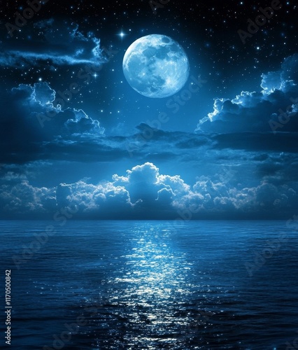 Fototapeta premium Nightscape Full Moon over Calm Ocean, Starry Sky, Clouds, Night Photography,...