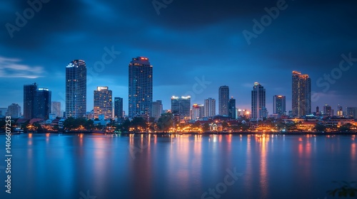 Naklejka premium Nightscape Reflections: Bangkok's Skyline Illuminates the Chao Phraya River