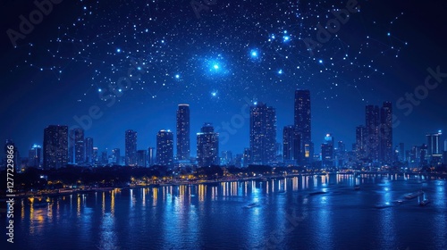 Fototapeta premium Nightscape Symphony, A City's Reflection Under a Celestial Network