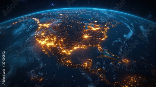© Innovator587, Fototapeta premium Nighttime aerial view of north america with city lights illuminated from space