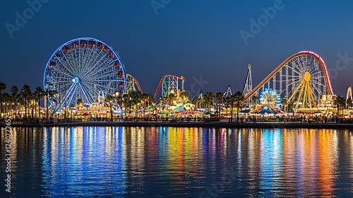 Obraz premium Nighttime amusement park, waterfront, reflection