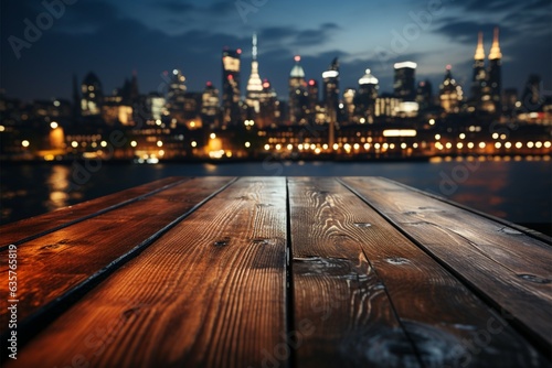 © Jawed Gfx, Fototapeta premium Nighttime atmosphere Wooden table with city buildings softly blurred in the backdrop Generative AI