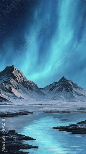 Naklejka premium Nighttime aurora borealis over snowy mountains reflecting in a calm lake, a...