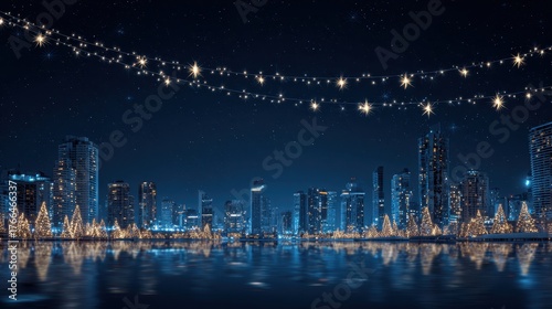 Fototapeta premium Nighttime city skyline with illuminated skyscrapers and reflected starscape