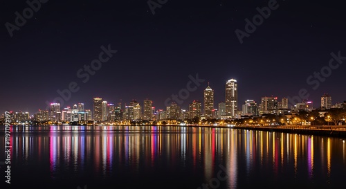 Fototapeta premium Nighttime city skyline with vibrant lights reflecting in the water along the waterfront