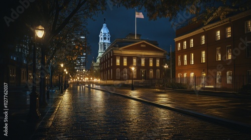 © Ali, Fototapeta premium Nighttime city street, historic buildings, rain-slicked cobblestones.