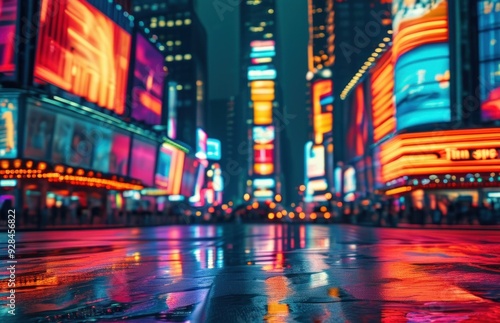 Fototapeta premium Nighttime city street illuminated by neon signs.