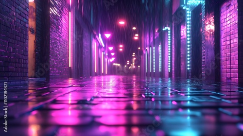 © Chexy139, Fototapeta premium Nighttime city street illuminated by vibrant neon lights reflecting on wet pavement in a bustling urban environment