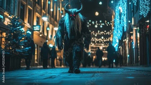 Fototapeta premium Nighttime City Stroll of a Figure in a Dark, Furry Costume with Horns, Walking Through Festive Lights
