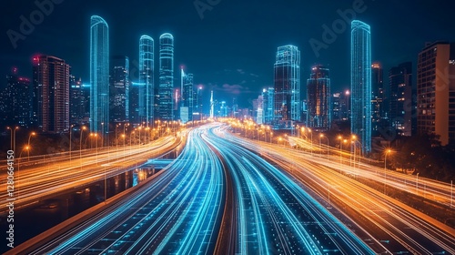 Naklejka premium Nighttime cityscape featuring illuminated buildings and traffic trails on a highway