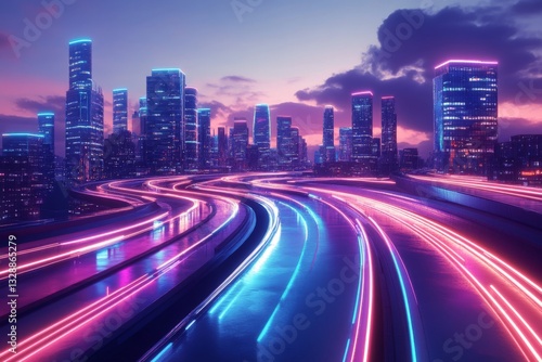 © ChaoticMind, Fototapeta premium Nighttime cityscape illuminated by vibrant neon lights along a busy highway with glowing trails