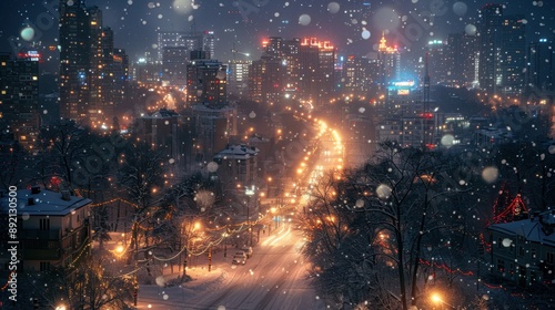 Fototapeta premium Nighttime cityscape in winter, twinkling lights, snowy streets, festive atmosphere, urban winter night, city lights, copy space.