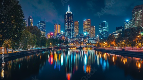 © Kitta Studio, Obraz premium Nighttime Cityscape of Melbourne with River Reflections and Lights