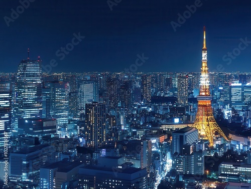 Obraz premium nighttime cityscape showcases towering high-rise buildings shimmering with...