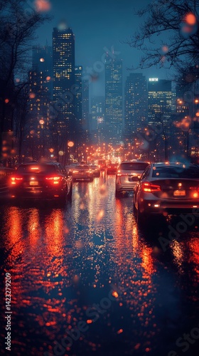 © wang, Fototapeta premium Nighttime cityscape through a car window, blurred lights and reflections, evoking a sense of urban solitude and quiet introspection.