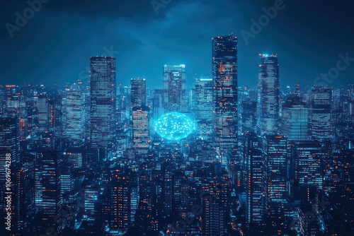 Naklejka premium Nighttime Cityscape with a Glowing Neural Network Representation