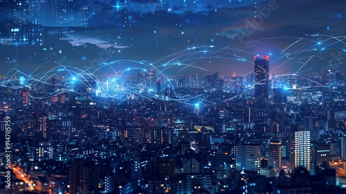 © julio, Obraz premium Nighttime Cityscape with Digital Network