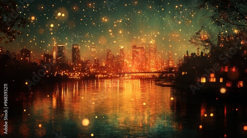 © addymawy, Fototapeta premium Nighttime Cityscape with Glowing Lights and Water Reflection
