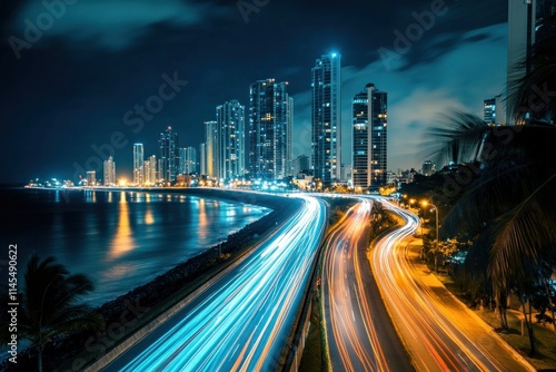© BerkahStock, Obraz premium Nighttime cityscape with illuminated buildings and light trails from moving vehicles.