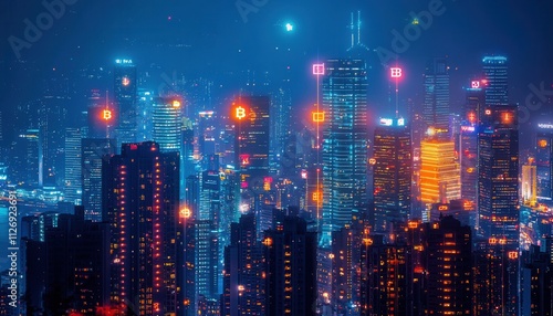 Fototapeta premium Nighttime Cityscape with Illuminated Buildings and Vibrant Lights Overlooking...