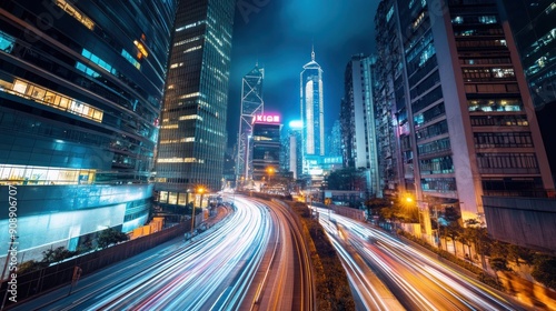 © saefur, Fototapeta premium Nighttime Cityscape with Light Trails in Hong Kong