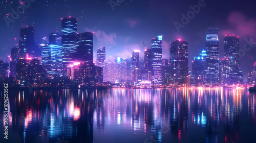 © Kashif, Obraz premium Nighttime cityscape with lively lights and reflections along the water
