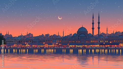 © Gea, Fototapeta premium Nighttime Cityscape with Mosques and Starry Sky