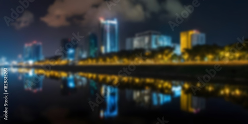 Fototapeta premium Nighttime Cityscape with Reflections and Illuminated Skyscrapers Blur photo Concept