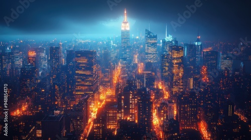 © hanafi 99d, Fototapeta premium Nighttime Cityscape with Skyscrapers and Lights