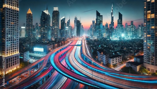 © Henry, Fototapeta premium Nighttime Cityscape with Traffic Trails